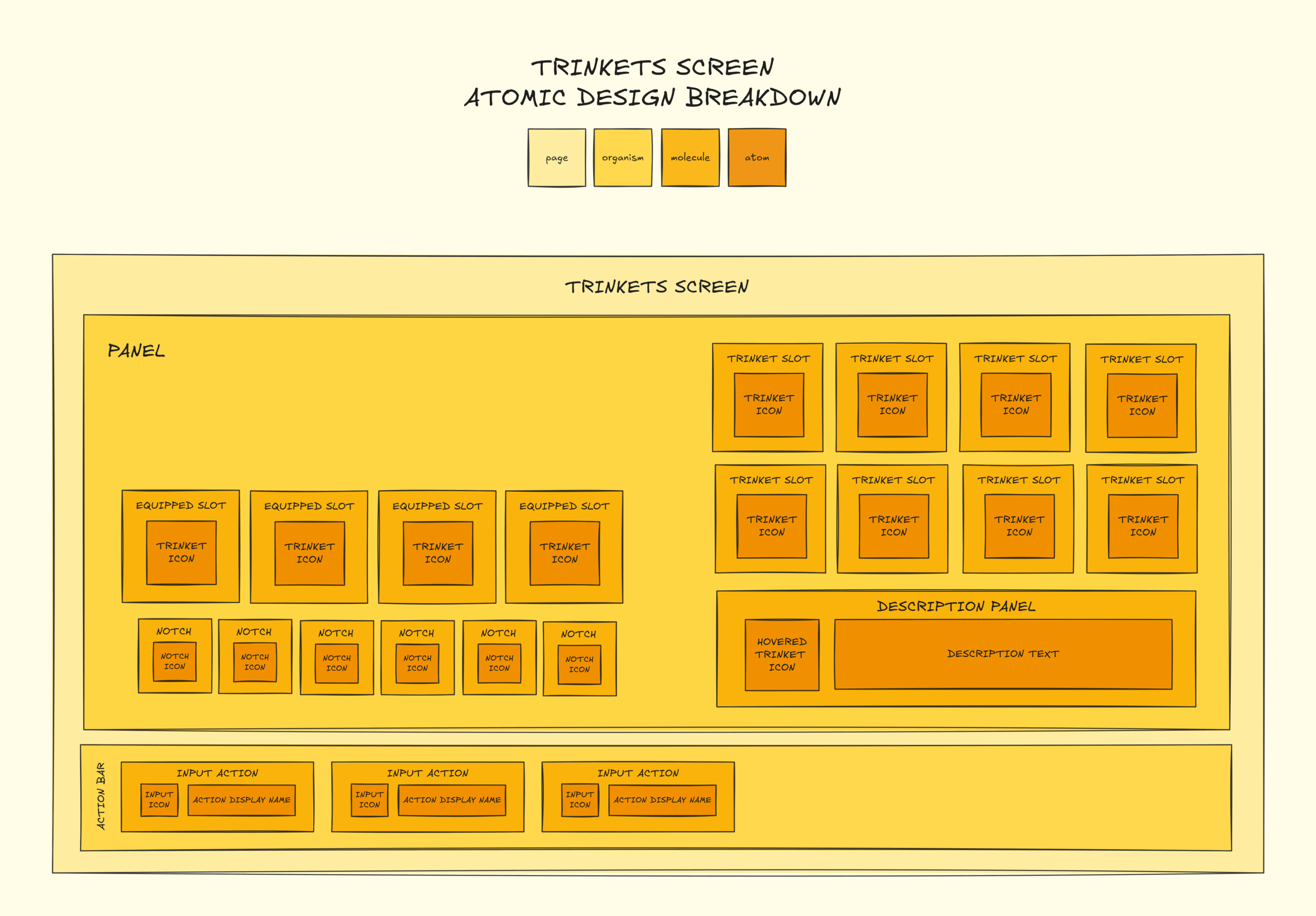 Trinkets Screen Diagram. Breakdown of the screen structure following atomic design and implemented screen.