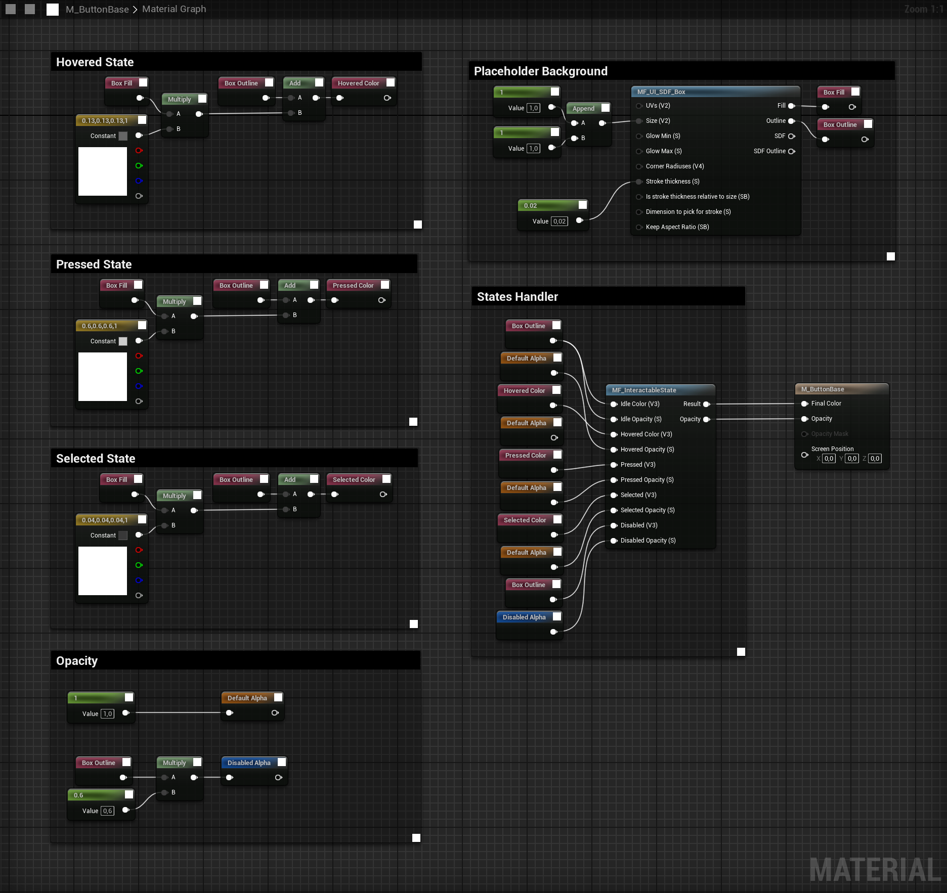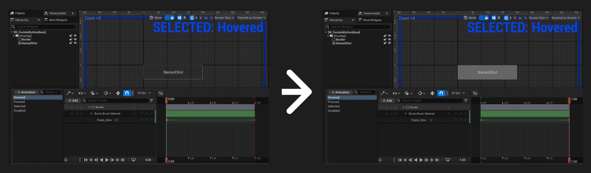 For animation and visual feedback, we’ve used a hybrid approach. Inspired by Epic’s own UI development guidelines, we’ve chosen to build shader-driven UI materials wherever it makes sense. This gives us better performance and a cleaner, modifiable setup compared to timeline-heavy animations to support a more responsive and visually engaging interface. By combining materials and sequencer, we’re aiming for a UI that’s expressive, optimized, and modular.