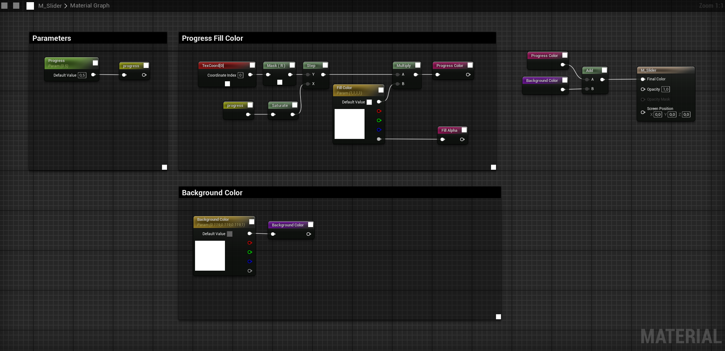 The Slider uses an invisible, hit-testable Analog Slider as the actual button input, with a Progress Bar Material layered on top. The material values are driven by the analog slider by updating the Progress scalar parameter.