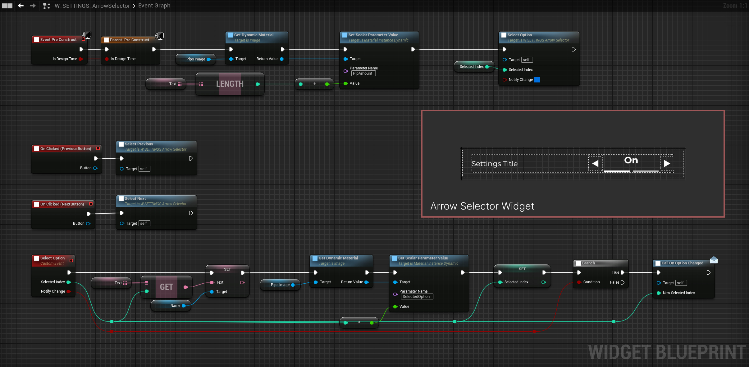 The Arrow Selector is more complex. It handles both multiple-choice options and toggles. We define an array of options, and its length sets the material’s pip count. Every time the user changes the option, the material updates to show the currently selected position. To support natural gamepad navigation, we also had to manually configure the Left and Right navigation rules.