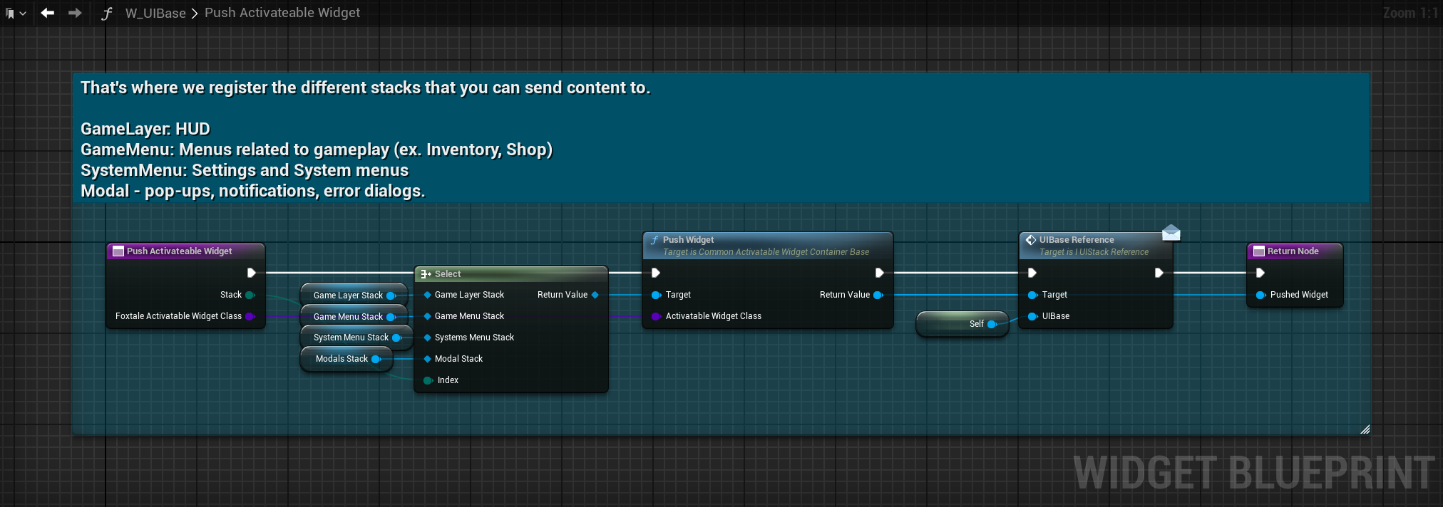 Our system is built around a central UI Base, which holds references to four distinct Common Activatable Widget Stacks, each handling a specific category of screens: